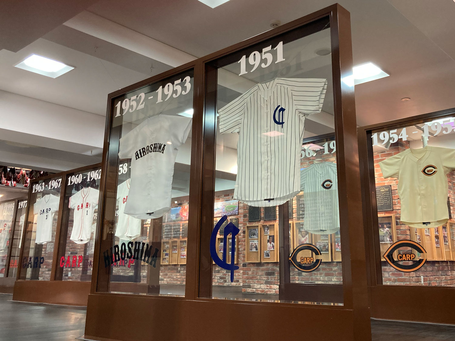 年代ごとのユニフォームや優勝記念トロフィー、年別の新入団選手の名前が彫られた銅板などを展示しています。1950年から今までの広島東洋カープの歴史を見て感じていただけます。