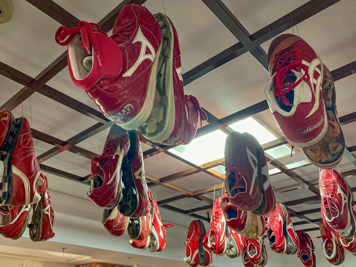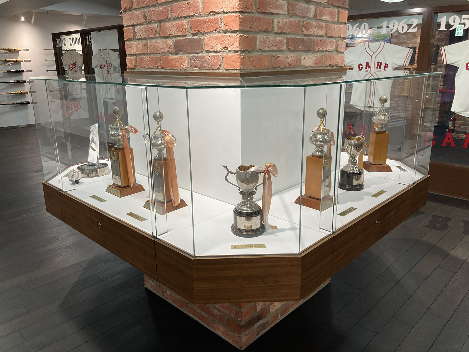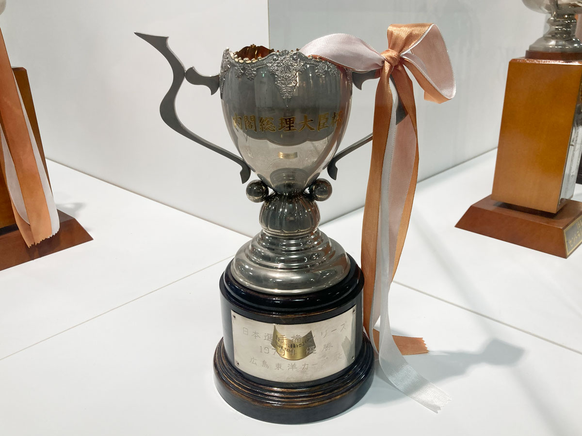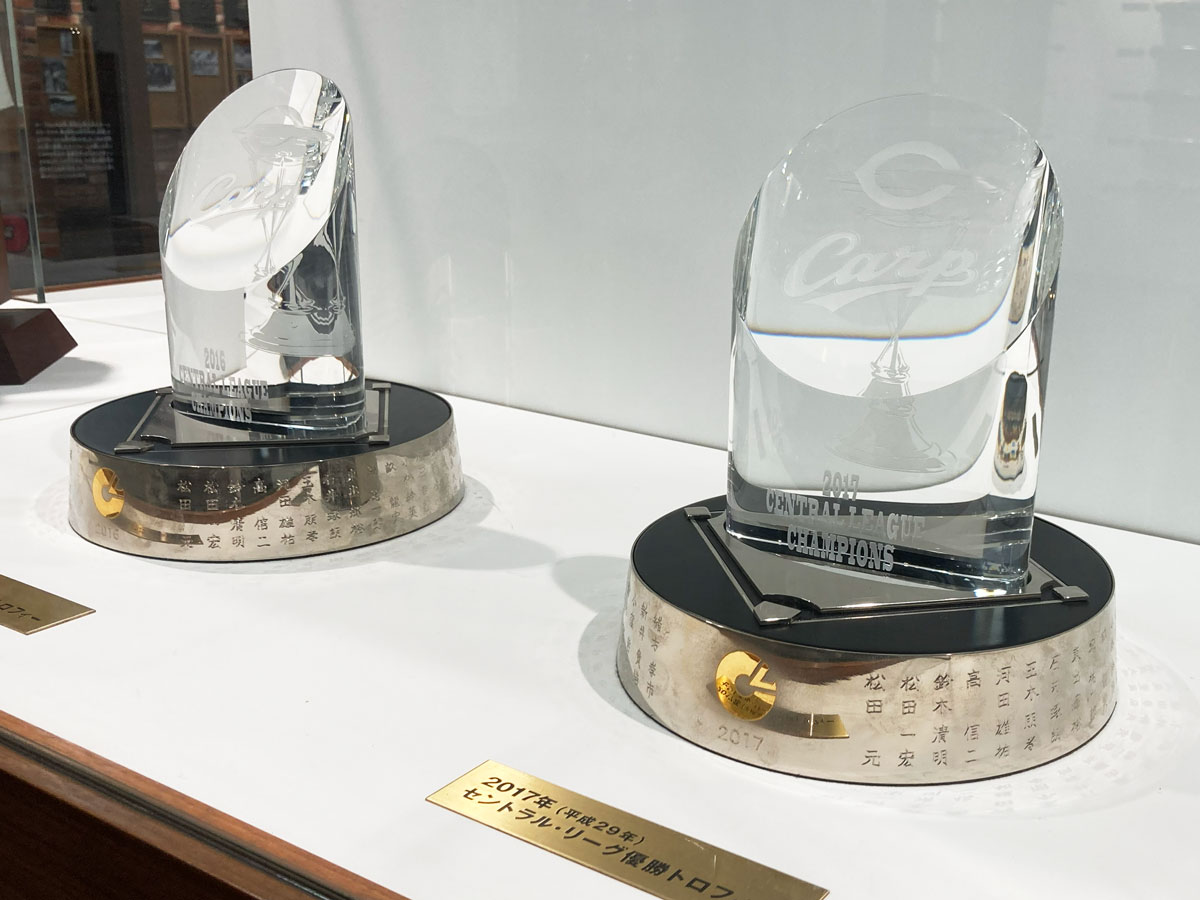 ギャラリー中央には、優勝や記録達成を記念して贈られたトロフィーを展示しています。 輝きを放つトロフィーの数々は、選手たちの努力と球団の歩みを象徴するものであり、カープが積み重ねてきた栄光の瞬間を静かに物語っています。