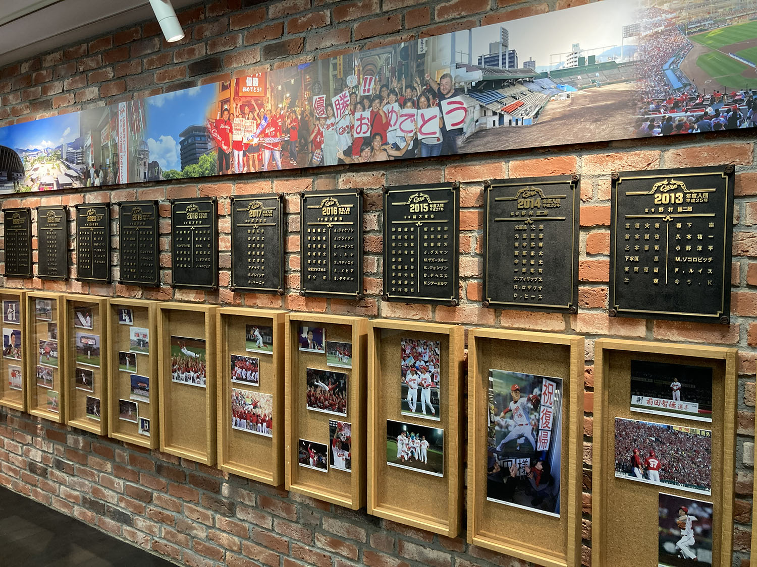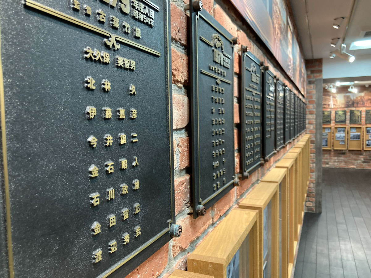 ギャラリーの入口を進むと、壁面には年代ごとに整理された銅板が並び、その年の監督や新入団選手の名前が刻まれています。当時のチーム編成を振り返りながら、カープの歩みをたどることができます。また、写真も併せて展示しており、選手たちの表情や試合の熱気を臨場感とともにご覧いただけます。