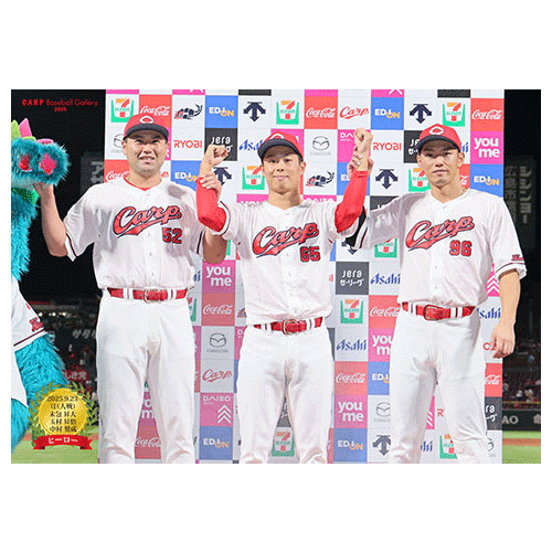 9/23(火・祝)対巨人戦のヒーロー、末包昇大選手、玉村昇悟選手、中村奨成選手のポスターです。